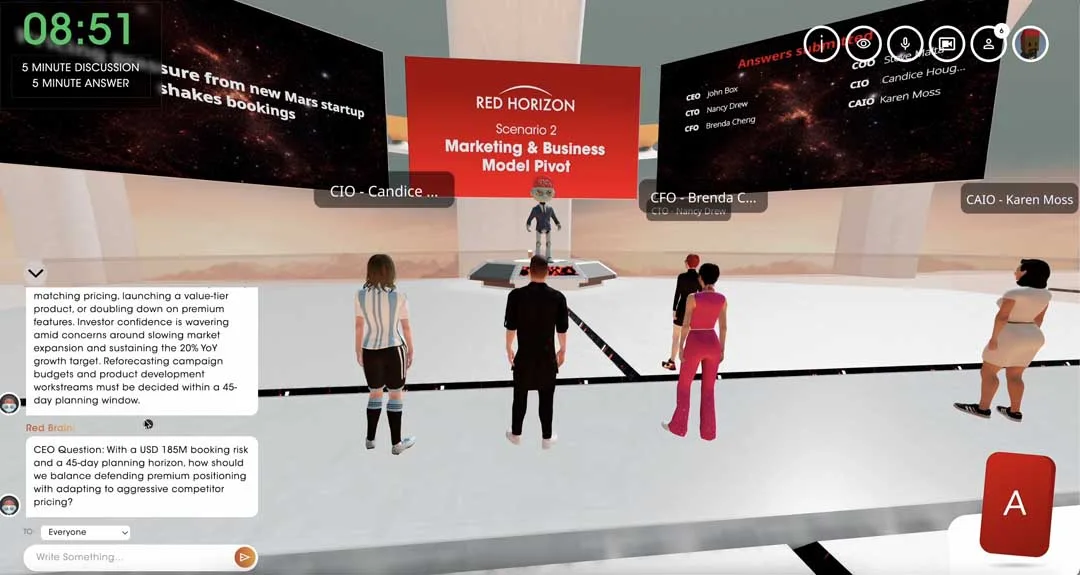 Red Horizon combines TTRO’s decades of experience in physical simulations and experiential learning with UBU’s immersive metaverse platform to create a fully interactive, role-based learning environment. Here, participants get to step into simulated organisational roles and navigate high-stakes scenarios in real time – under the guidance of RedBrain, an AI Chairman that evaluates and gives feedback on their decisions across strategy, risk, people, innovation, and performance.